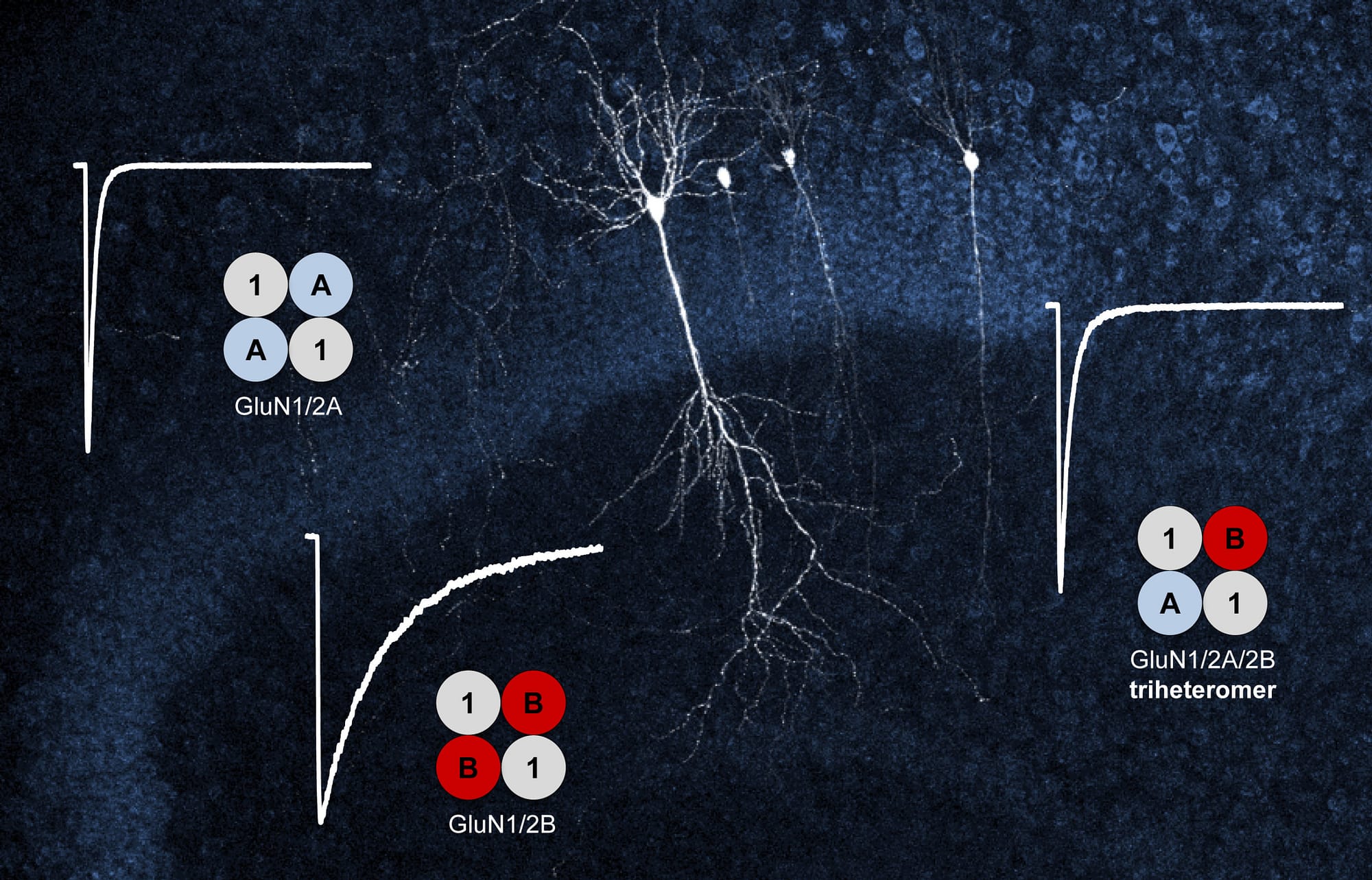 The seven NMDA receptor subunits (GluN1, GluN2A-D, and GluN3A-B) assemble as tetrameric receptors composed of two GluN1 together with two GluN2 or two GluN3 subunits. Most, if not all, NMDA receptor-expressing cells express two different GluN2 subunits (e.g. GluN2A and GluN2B), and the majority of native NMDA receptors are triheteromers that contain two GluN1 together with two different GluN2 subunits (e.g. GluN1/GluN2A/GluN2B). Function and pharmacology of these triheteromeric NMDA receptors are poorly understood due to the problem that co-expression of three different subunits in heterologous expression systems will yield multiple different receptor populations. We have developed a method to control the subunit composition of NMDA receptors, thereby enabling selective expression of triheteromeric NMDA receptors. This approach provides opportunities to develop therapeutic agents that target disease-relevant native triheteromeric NMDA receptor sutypes.